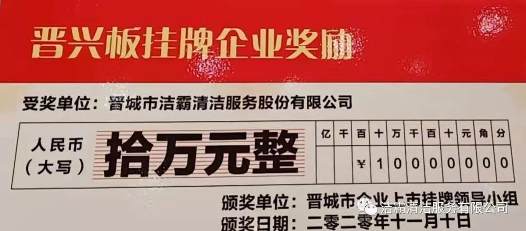 晉城市潔霸清潔服務(wù)股份有限公司于2019年11月27日成功登陸山西股權(quán)交易中心“專精特新板”(晉興板)(企業(yè)代碼:060200Z),是“專精特新板”開板暨首批掛牌的14家企業(yè)之一。“專精特新板”是山西股權(quán)交易中心設(shè)立的特色板塊,為省內(nèi)具備專業(yè)化、精細(xì)化、特色化、新穎化的優(yōu)質(zhì)企業(yè)提供專屬服務(wù),成為帶動全省中小企業(yè)創(chuàng)新創(chuàng)造、轉(zhuǎn)型升級,壯大工業(yè)高質(zhì)量發(fā)展的生力軍。“晉興板”掛牌,標(biāo)志著公司正式進(jìn)軍資本市場,豐富了融資渠道,推動公司高質(zhì)量轉(zhuǎn)型發(fā)展,成為公司發(fā)展的新引擎。
