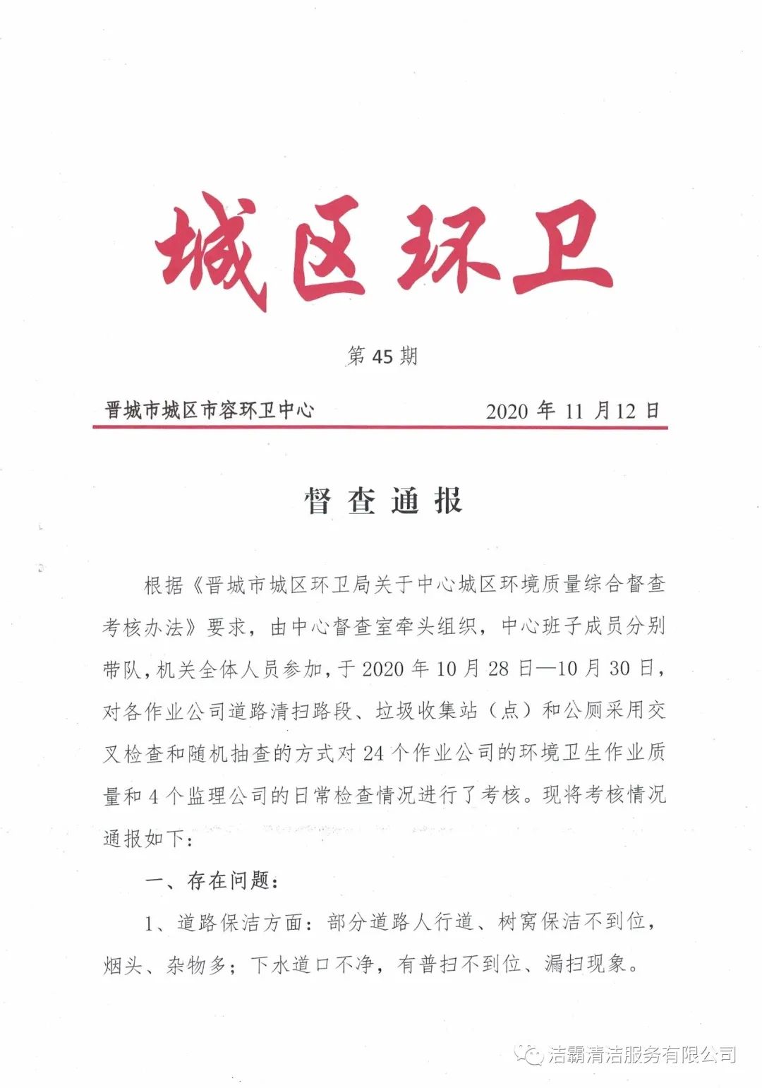 2020年10月28日—10月30日,晉城市城區(qū)市容環(huán)衛(wèi)中心由中心督查室牽頭組織,中心班子成員分別帶隊,機關全體人員參加,對各作業(yè)公司道路清掃路段、垃圾收集站(點)和公廁采用交叉檢查和隨機抽查的方式對24個作業(yè)公司的環(huán)境衛(wèi)生作業(yè)質(zhì)量和4個監(jiān)理公司的日常檢查情況進行了考核。晉城市潔霸清潔服務股份有限公司所屬的環(huán)衛(wèi)四公司分數(shù)最高,名列第一。