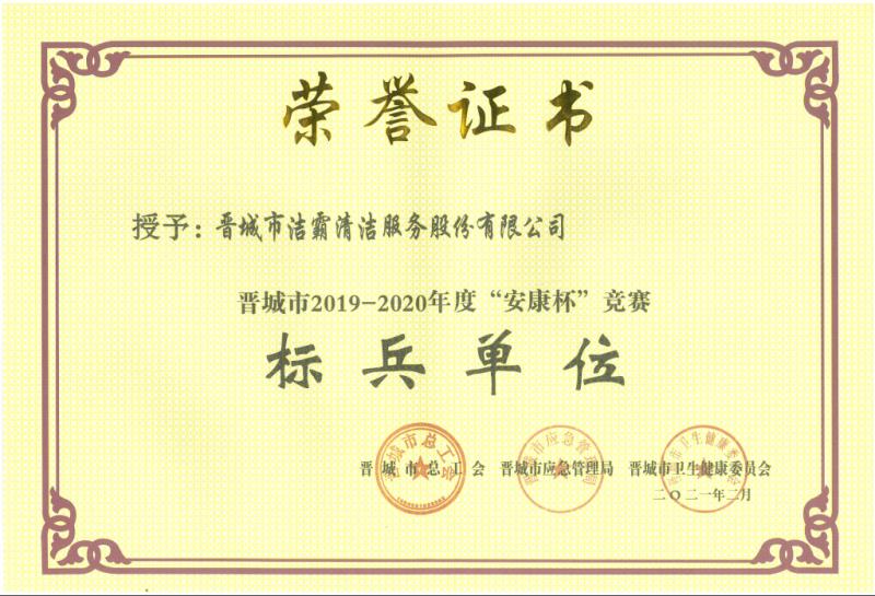 日前,在2019----2020年度全市“安康杯”競賽活動中,晉城市潔霸清潔服務(wù)股份有限公司被晉城市總工會、晉城市應(yīng)急管理局、晉城市衛(wèi)生健康委員會聯(lián)合授予“安康杯”競賽“標(biāo)兵單位”。