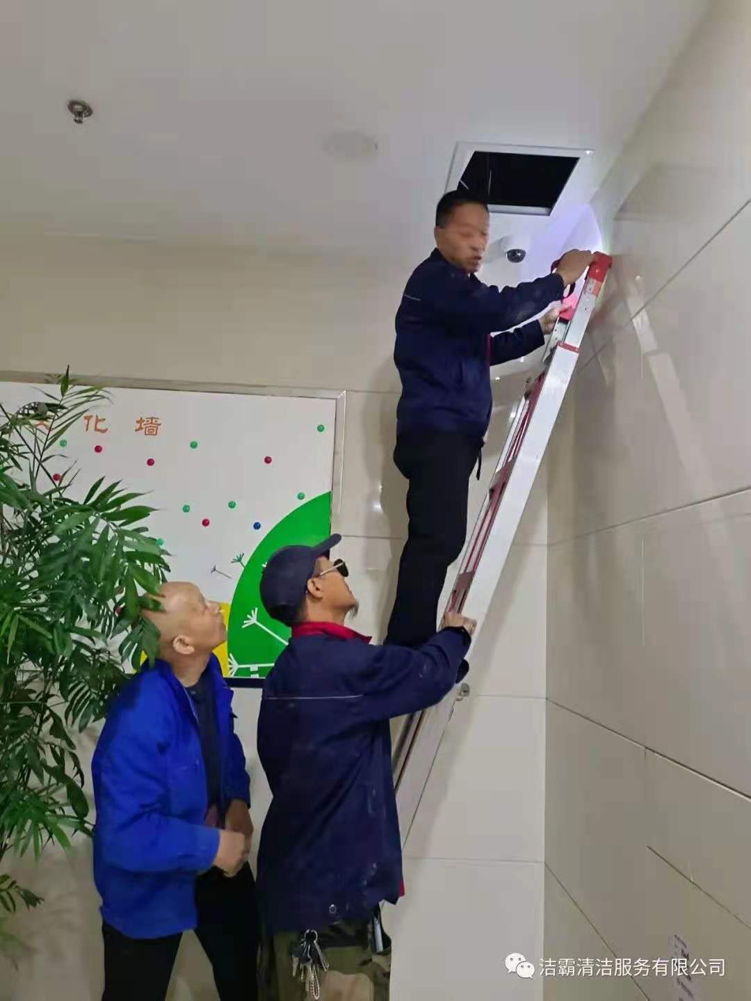 工程部的李新芳和郭軍田兩位師傅,有著豐富的工作經(jīng)驗(yàn),他們順著污水主管道,敲敲打打,根據(jù)聲音辨別堵塞部位。尋找病癥部位比較容易,但治療起來太艱難。管道在二樓與三樓之間,A單元樓下農(nóng)商銀行的天花板里。施工場(chǎng)地離地面四五米高,施工要爬高上梯且空間狹窄逼仄,天花板一處開口勉強(qiáng)能容一個(gè)人鉆進(jìn)去,給施工造成很大困難。