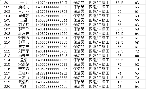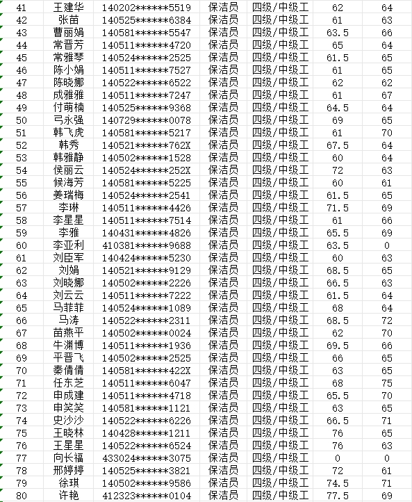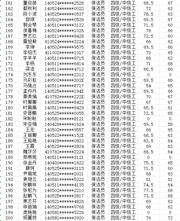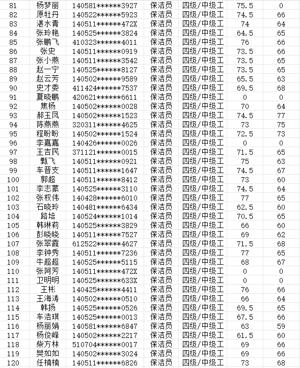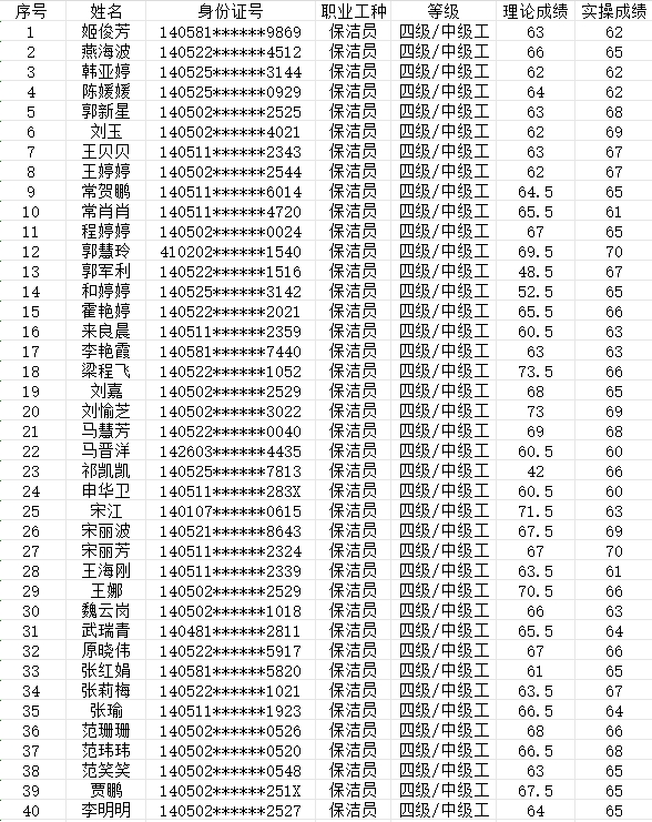 晉城市潔霸清潔服務(wù)股份有限公司職業(yè)技能等級(jí)認(rèn)定中心現(xiàn)將2024年2月25日認(rèn)定人員成績公示如下: