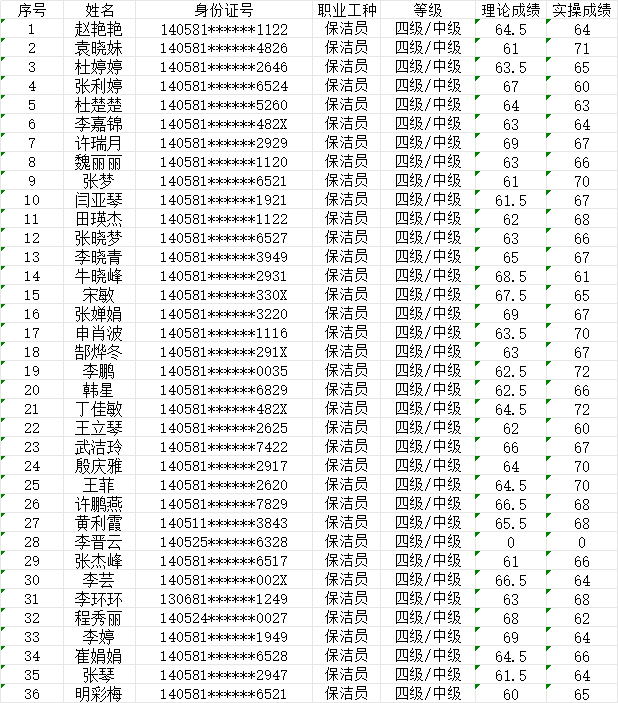 晉城市潔霸清潔服務(wù)股份有限公司職業(yè)技能等級(jí)認(rèn)定中心2024年5月23日第15批保潔員中級(jí)認(rèn)定人員成績(jī)公示