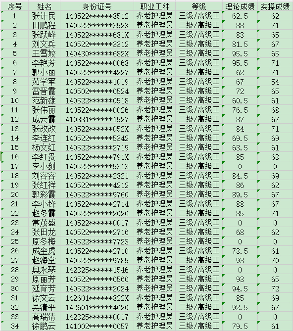 2024年5月20日下午第14批養(yǎng)老護(hù)理員高級(jí)認(rèn)定人員成績(jī)公示