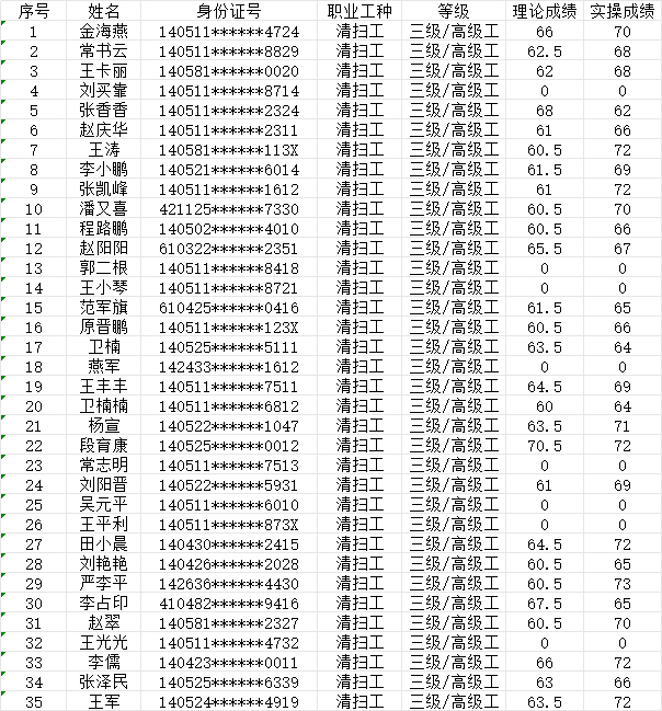 晉城市潔霸清潔服務(wù)股份有限公司職業(yè)技能等級(jí)認(rèn)定中心現(xiàn)將2024年7月14日認(rèn)定人員成績(jī)公示如下: