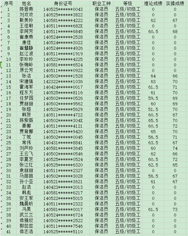 晉城市潔霸清潔服務(wù)股份有限公司職業(yè)技能等級(jí)認(rèn)定中心現(xiàn)將2024年8月4日認(rèn)定人員成績(jī)公示如下: