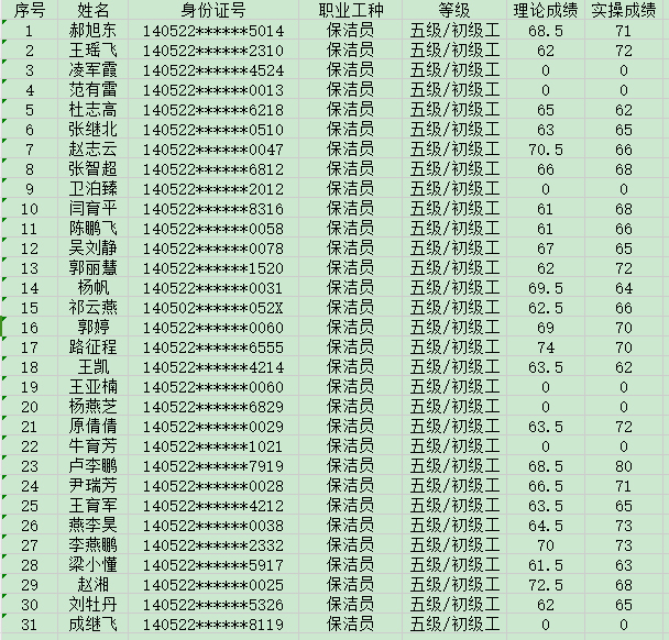 2024年8月24日第32批保潔員初級(jí)認(rèn)定人員成績公示