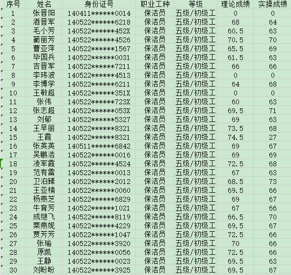 晉城市潔霸清潔服務(wù)股份有限公司職業(yè)技能等級認(rèn)定中心2024年8月31日第34批保潔員初級認(rèn)定人員成績公示
